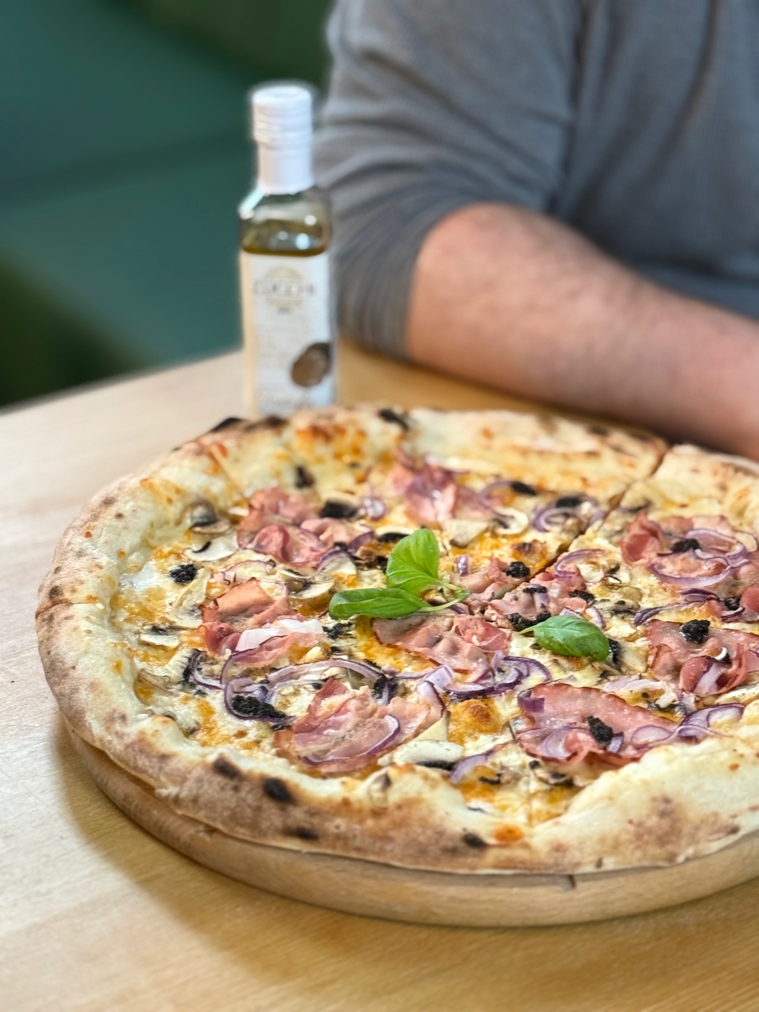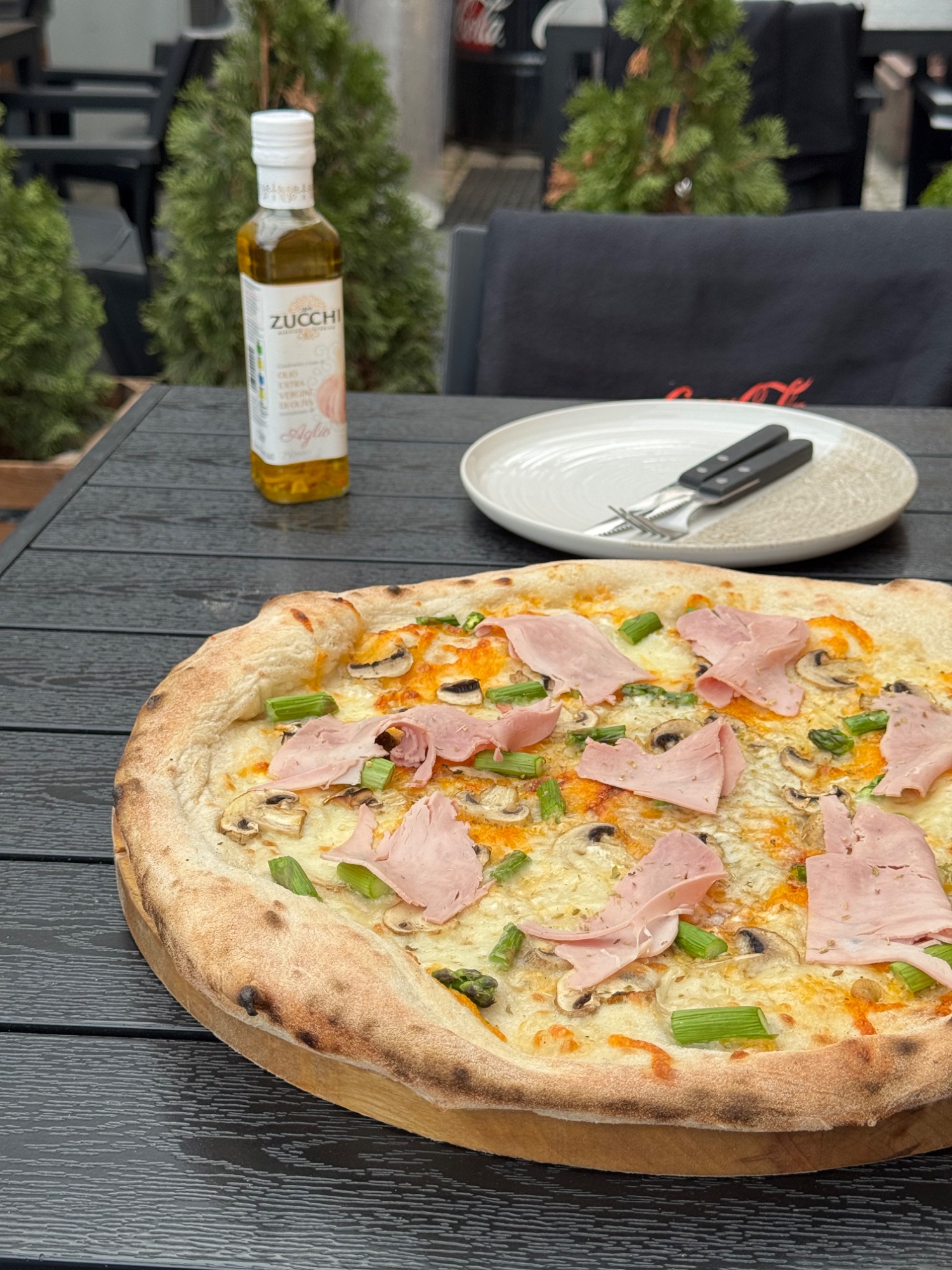 sos śmietanowy, ser, pieczarki, szparagi, szynkę cotto oraz świeżo mielony pieprz 🍕